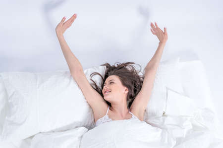 Beautiful smiling young woman waking up stretching in white bed in her room