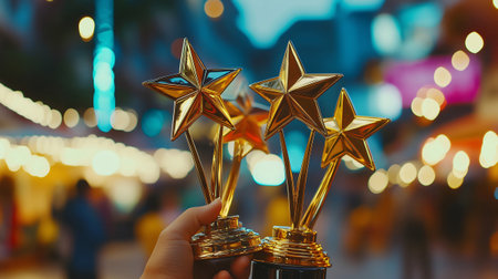 Hand holding three golden star award trophies with a blurred cityscape in the background