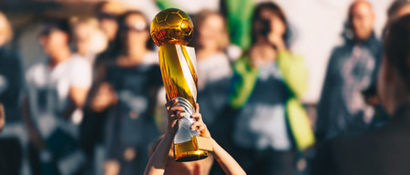 Golden trophy cup held by hand with blurred cheering crowd celebrating victory and success in competition or achievement