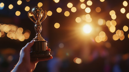 Hand holding a trophy illuminated by warm lights at a celebration event