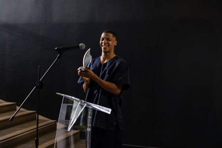 African American man in scrubs standing behind podium holding silver trophy at microphone on stage. Award, recognition, achievement, celebration, speaker, presentation, ceremony