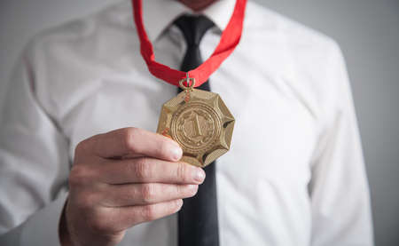 Businessman with gold medal. Medal awards for winner