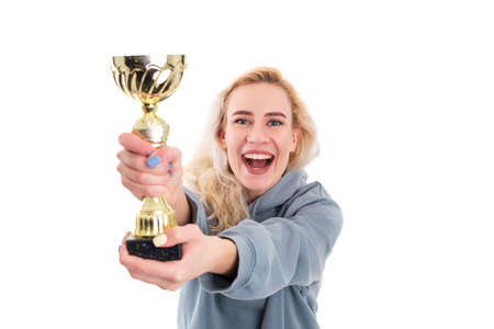 Winning competitions. A young woman with a golden cup. Selective focus on the cup. Isolated