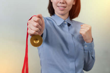 Working woman holding a gold medal, Successful business concept.