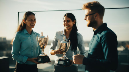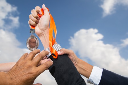 Happy successful business team as winner in competition with medal