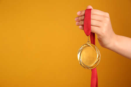 Woman holding gold medal on yellow background, closeup. Space for text