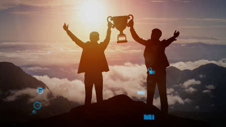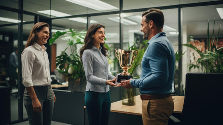Winner business team concept, Business man holding a golden trophy with his partner congratulation for reward in office