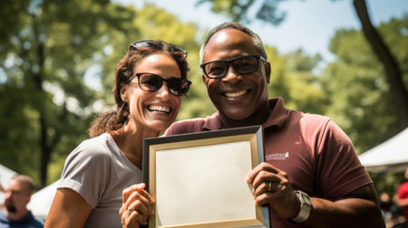 Friends celebrate successful charity event in tranquil park.