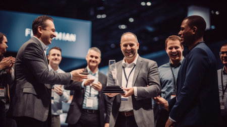 Trophy presentation with cheering colleagues.