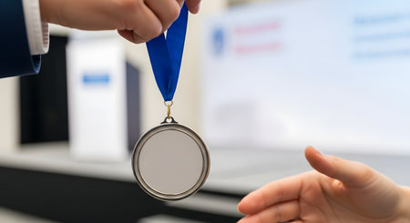 A close-up shot shows a person in a suit presenting a blank gold medal with a blue ribbon to another person, whose hand is open to receive it. The background is blurred, suggesting an awards ceremony, and the image represents achievement, success, and recognition.