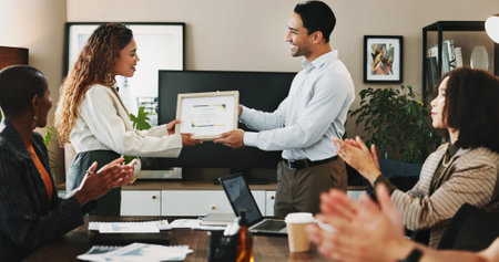 Office, woman and man with applause at award ceremony for achievement, success and well done. People, employees and happy or clapping hands at boardroom with certificate for celebration or completion