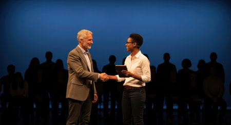 Caucasian male and african female adults shaking hands on stage presentation