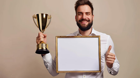man holding a blank diploma frame and a golden award trophy, symbolizing achievement and success.
