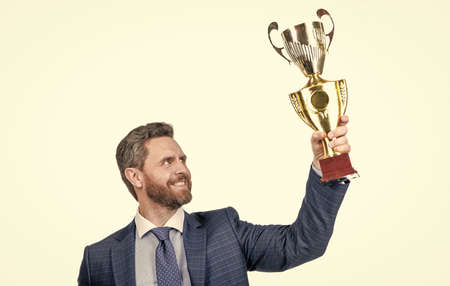 successful man in suit hold champion cup s business reward isolated on white, success.