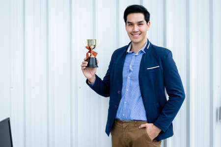Portrait of successful feeling winner screaming handsome young asian businessman holding a champion cup at In the office room background.