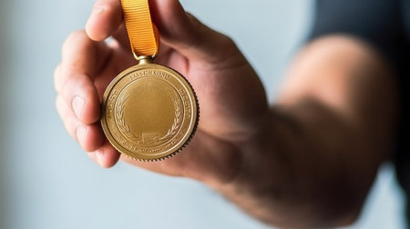 Hand holding gold medal first place. Winner of competition concept