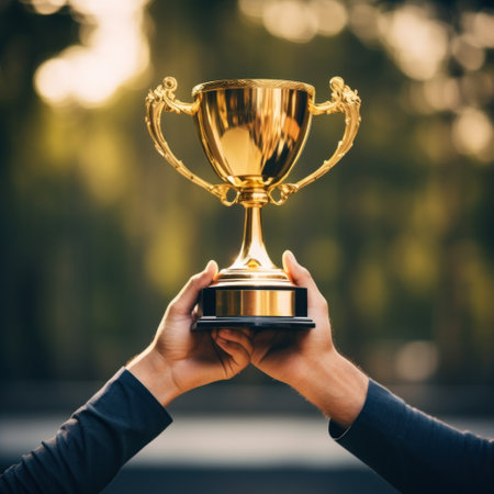 Hand holding up a gold trophy cup as a winner in a competition