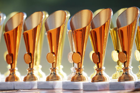 Award trophies waiting for competitors after amateur equestrian championship in row. Golden silver and bronze prizes for winners at an outdoor sport event. Colorful sport trophy background