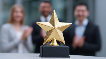 A stunning golden star trophy is showcased prominently, symbolizing achievement and success, while people in the background applaud, celebrating a moment of victory in a professional setting.