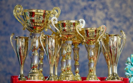 A close-up shot of various trophies and awards, some gold and silver, displayed on a rustic wooden surface with a blurred background.