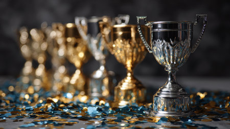 A Row of Shiny Trophies on a Colorful Confetti-Laden Surface Celebrating Success and Achievement in a Festive Setting