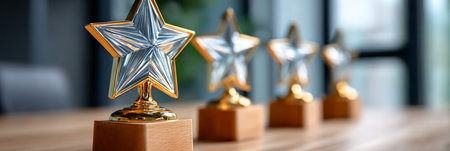 Elegant silver star trophies on wooden desk, celebrating success and achievement awards.
