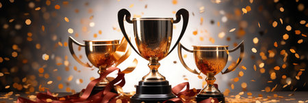 A golden trophy stands prominently against a dark backdrop, with confetti adding a celebratory touch, symbolizing achievement and success.
