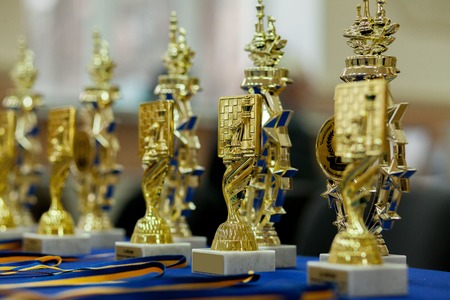 A collection of gleaming trophies and awards, including a star-topped award and a blue ribbon, set against a soft purple background.