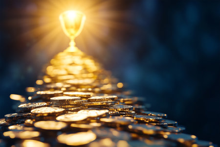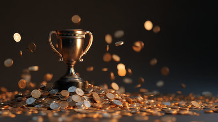 Trophy stands proudly atop mound of shimmering coins, symbolizing victory and wealth. warm glow of coins creates celebratory atmosphere, evoking feelings of achievement and success