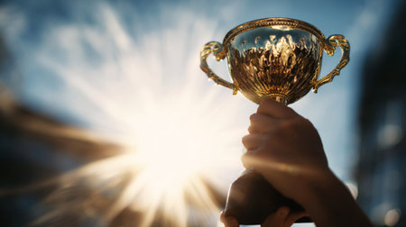 A hand holds a golden trophy aloft against the backdrop of bright sunlight, celebrating victory and achievement in sports or personal accomplishments.