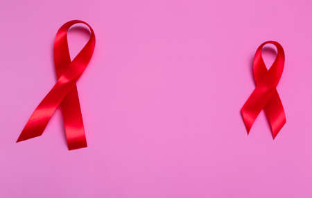 Top view on pink background with red ribbon concept December 1st International AIDS Day close-up.