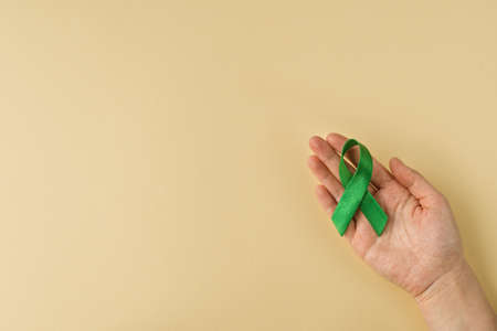 World bipolar day. Adult hand holding green ribbon on beige background. Mental health awareness day, Depression, Cerebral palsy. World kidney day.