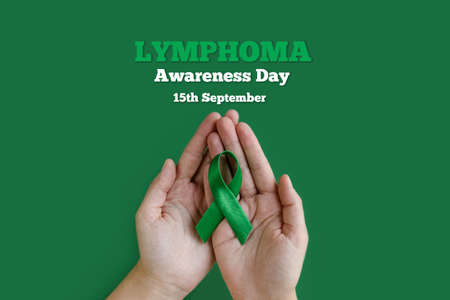 Adult hands holding green ribbon on green background. World lymphoma awareness day. September 15. Cancer and Lymphoma Awareness month