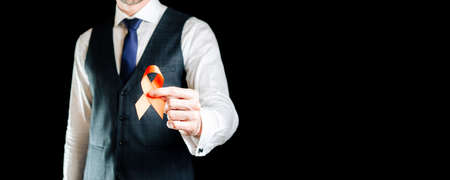 closeup of a young caucasian man, in a gray t-shirt, showing an orange ribbon, in support of people affected by multiple sclerosis