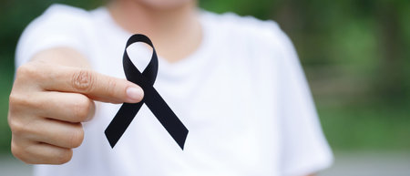 Woman holding black Ribbon for Melanoma and skin cancer, Vaccine injury awareness month, grief and rest in peace. Healthcare and Racist concept