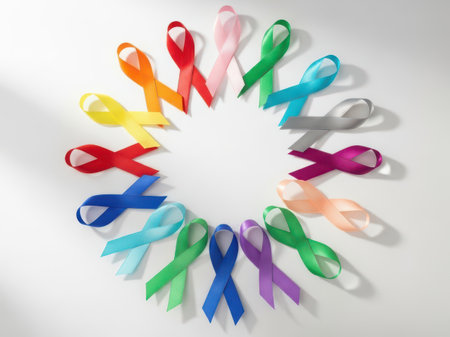 Cancer disease symbol with colored ribbons on white background close-up on world Cancer Awareness Day