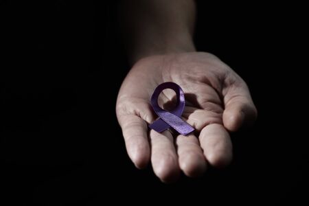 Two hands, aged and weathered, cradle a vibrant purple ribbon. The image features a shallow depth of field, emphasizing the central subject against a dark background. The lighting is soft and diffused, creating a somber yet hopeful mood. Suitable for various editorial and commercial applications related to social causes and advocacy.