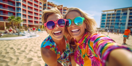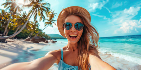 Friends taking a selfie on a tropical beach. Summer vacation and travel concept. Design for social media, travel blog, and holiday banner