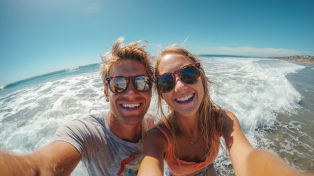 A young couple stands at the shoreline, smiling broadly as waves splash around them. The sun shines brightly, creating a fun and relaxed atmosphere, perfect for enjoying the beach.