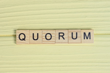 the gray word quorum of gray small wooden letters lie on a yellow table