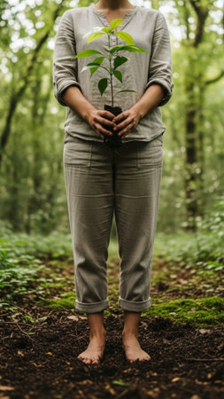 A striking vertical full body shot capturing the essence of Earth Day. A centered individual stands
