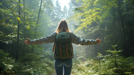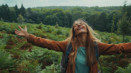 Joyful woman with a backpack in the green expanse of Cannock Chase forest