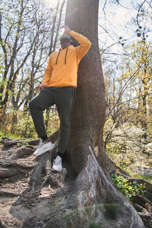 Hiker young man standing on tree trunk and looking away in the forest