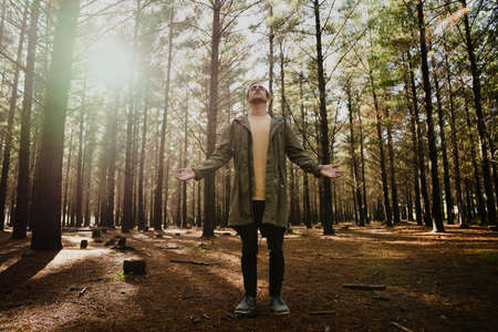 Young male taking in the surroundings of the forest, deep breaths and religious connection with nature