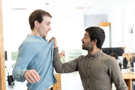 Angry hispanic man fighting and threatening a frightened caucasian coworker at the office.