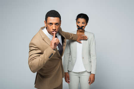 arrogant african american businessman showing hush sign and pushing away businesswoman with scotch tape on mouth isolated on gray