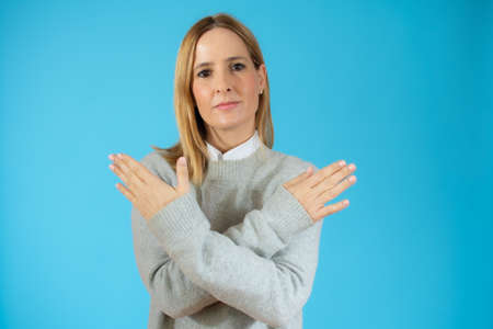 Young woman wearing casual sweater standing over blue isolated background rejection expression crossing arms doing negative sign