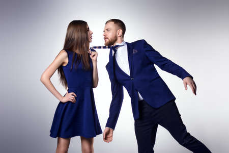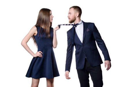 Close-up portrait of a beautiful young woman pulls to herself the man. Beauty, fashion. Love concept.