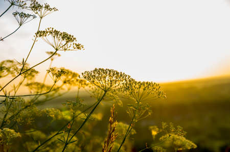 Wild grass flowers in a field at sunset. Flowers with film style. Selective focus.