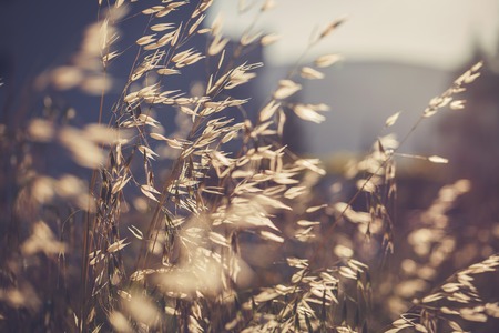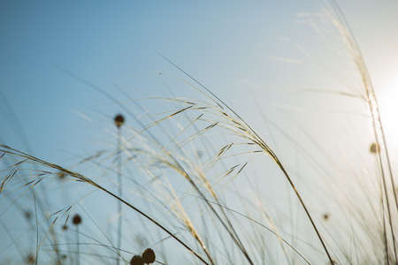 Selective soft focus of dry grass, stems blowing in the wind at golden sunset light. Nature, summer, grass concept.